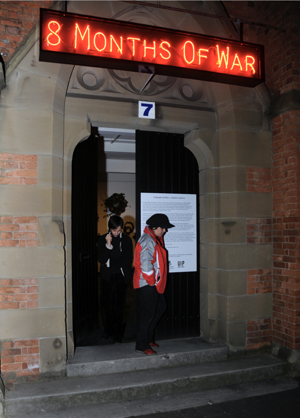 8 Months Of War: A Public Archive was an interactive work-in-progress where the public were invited to collaborate with the artist by either dropping into the space with news clippings, letters, personal stories and reflections or by sending email and faxes to build up an archive of connections exploring the nature of conflict in the world.
